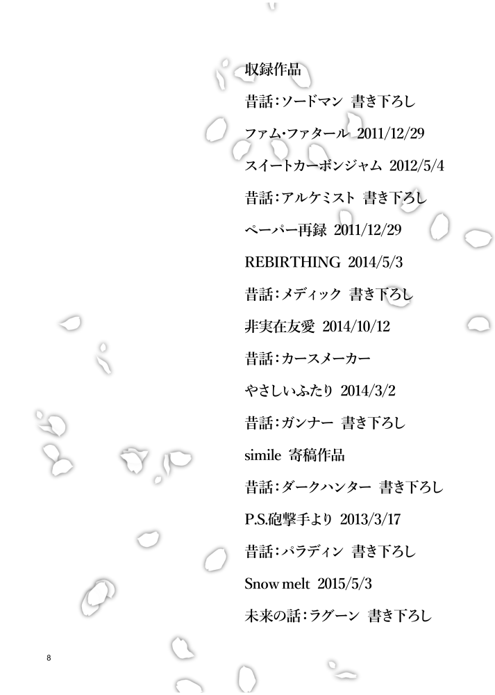 未選択 2016/10/10 次回イベント予告(11月アナコン4) 次回のイベント参加ですが、世界樹でアナザーコントロール4(11月6日)を予定しています。世界樹2の再録本(書き下ろしでギルド8人分それぞれの短編計8本、snowmelt全編作画書き直し)が出る予定です。まだ入稿が済んでませんので取り急ぎ。10/10の世界樹オンリーはサークル参加はありません。告知しそびれていましたが夏コミでもアンライトで参加していました。冬コミは世界樹で申し込みをしています。都合がつけば2月のアナコン5も検討中。